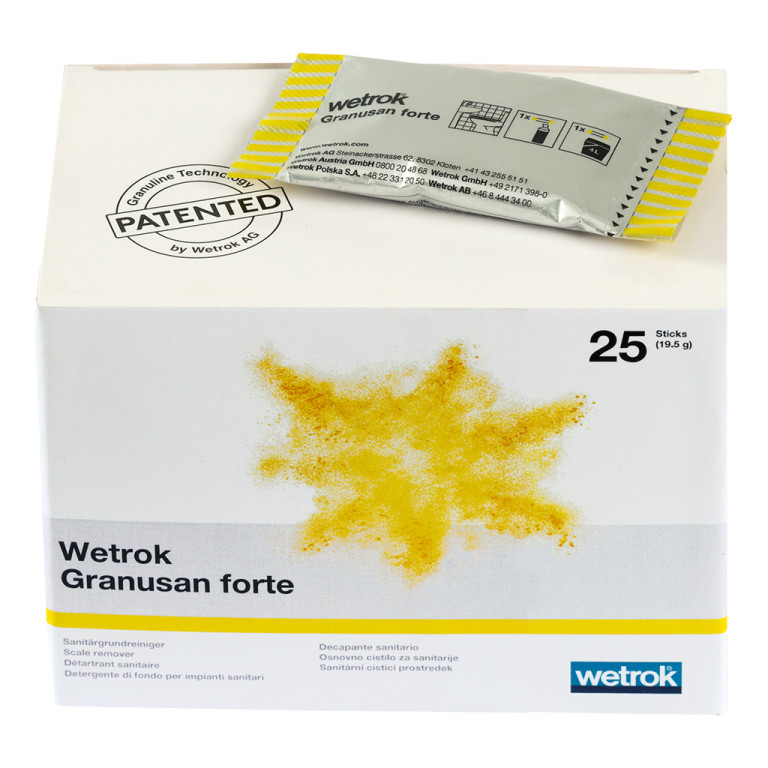 To dissolve the cleaning granules, pour granules into the filled foam bottle, close bottle and shake vigorously for 30 seconds. Wetrok Granusan forte is not suitable for acid-sensitive surfaces (limestone, marble, clinker, aluminum, etc.). The surface of the sanitary fitting must not be warm when cleaning.
